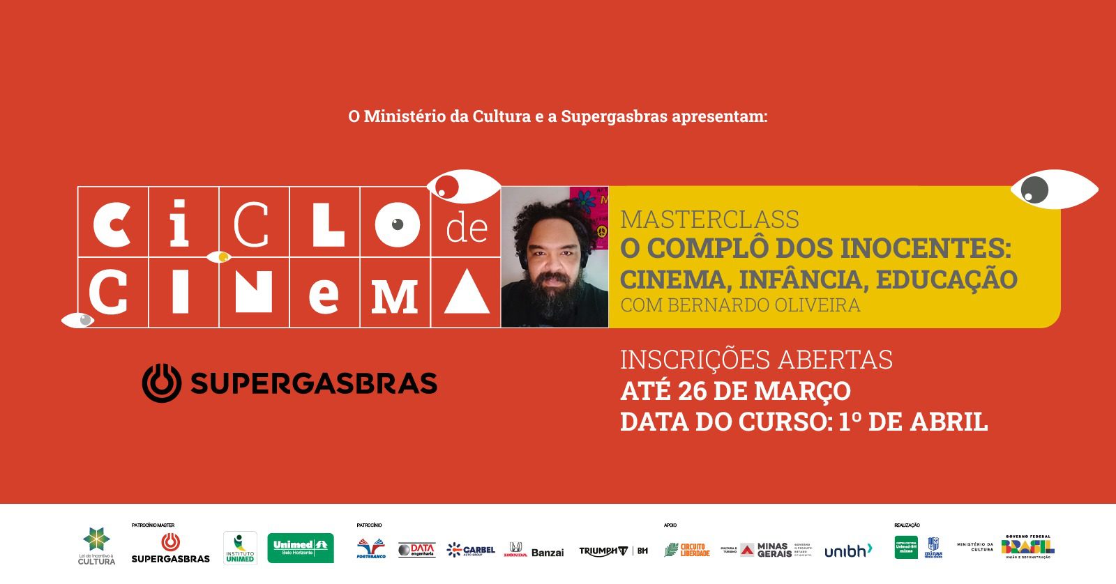 A masterclass “O complô dos inocentes: cinema, infância, educação” será realizada no dia 1º/4, sábado, das 10h às 12h, na Sala I do Cinema do Centro Cultural Unimed-BH Minas. O professor, pesquisador, crítico musical e de cinema e produtor Bernardo Oliveira, debaterá com professores de escolas públicas, pesquisadores e estudantes de cinema e/ou pedagogia e pessoas interessadas sobre as representações usuais de crianças nas telas de cinema. A masterclass faz parte do Ciclo Supergasbras de Cinema e as inscrições são gratuitas, realizadas no site da Sympla, até o dia 26/3, domingo. A aula terá intérprete de libras.