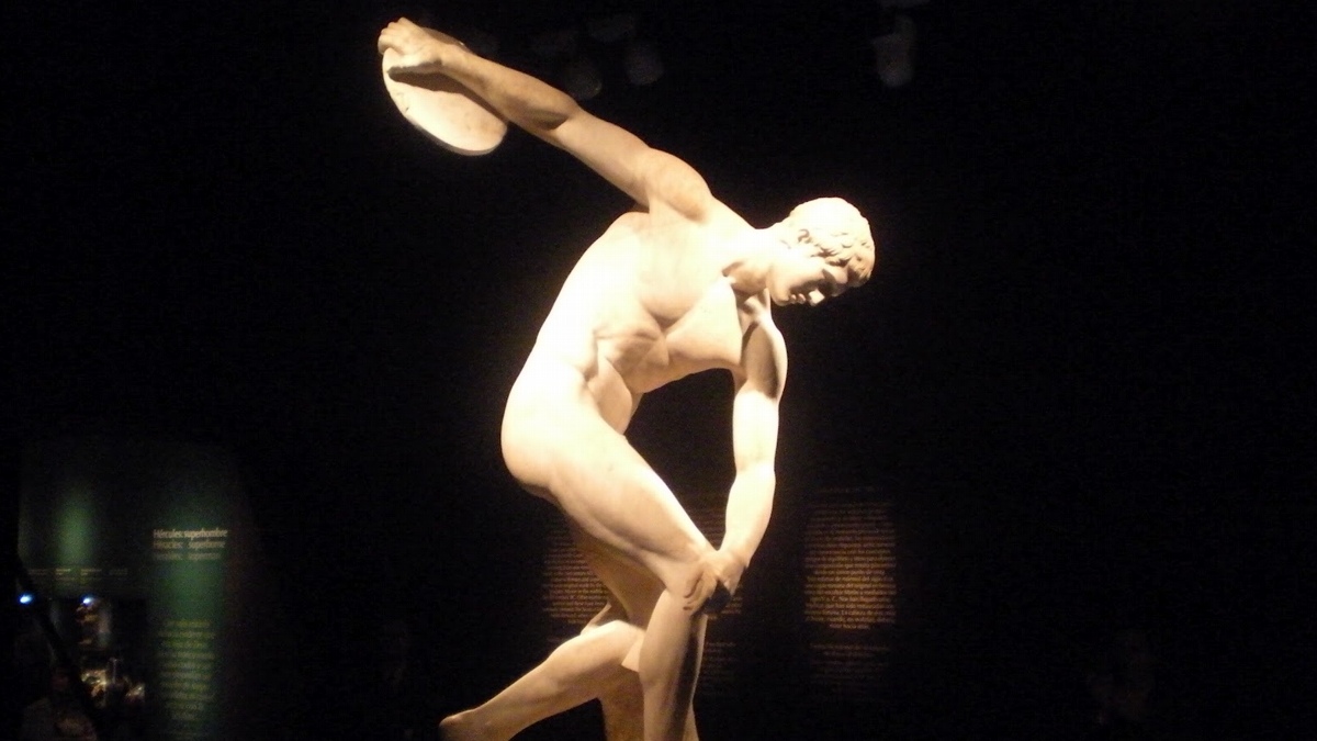 Há imagens da arte que remetem ao esporte, o Discóbolo é um deles. Esculpido pelo grego Míron, por volta do século V antes de Cristo (a.C.), a escultura tinha como objetivo homenagear um atleta na competição do lançamento de discos. Segundo a pesquisa de Carolina Santana, a obra original foi feita de bronze para homenagear o ganhador de pentatlo (competição de atletismo com corrida, arremesso de disco, salto, lançamento de dardo e luta). Tal guerreiro/herói foi prestigiado e perpetuado como vitorioso na história da humanidade e, em particular, do mundo esportivo, tornando-se ícone de perfeição do movimento, harmonia e proporção de cada músculo daquela organização sociocultural e seus valores político-ideológicos, mitológico-ritualísticos, artísticos, educacionais e militares da Grécia Antiga.