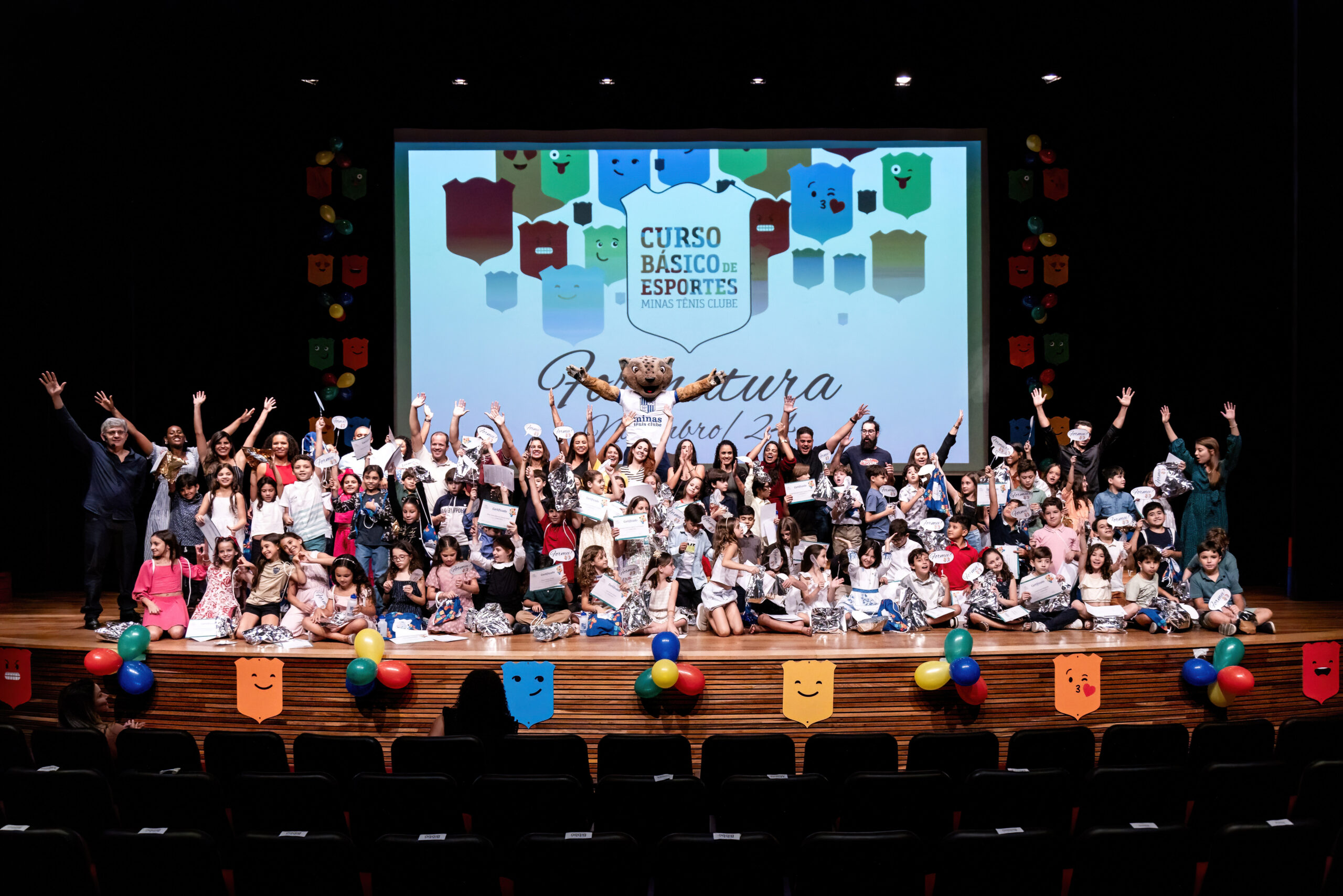 Na noite de ontem, 27/11, o Teatro do Centro Cultural Unimed-BH Minas recebeu a formatura das turmas do segundo semestre do Curso Básico de Esportes (CBES). O evento, que reuniu 65 alunos das Unidades Minas I, II e do Minas Náutico, marcou a conclusão do primeiro ciclo da formação esportiva do Clube. O Max, mascote do Minas, esteve presente e animou a noite dos formandos e familiares.