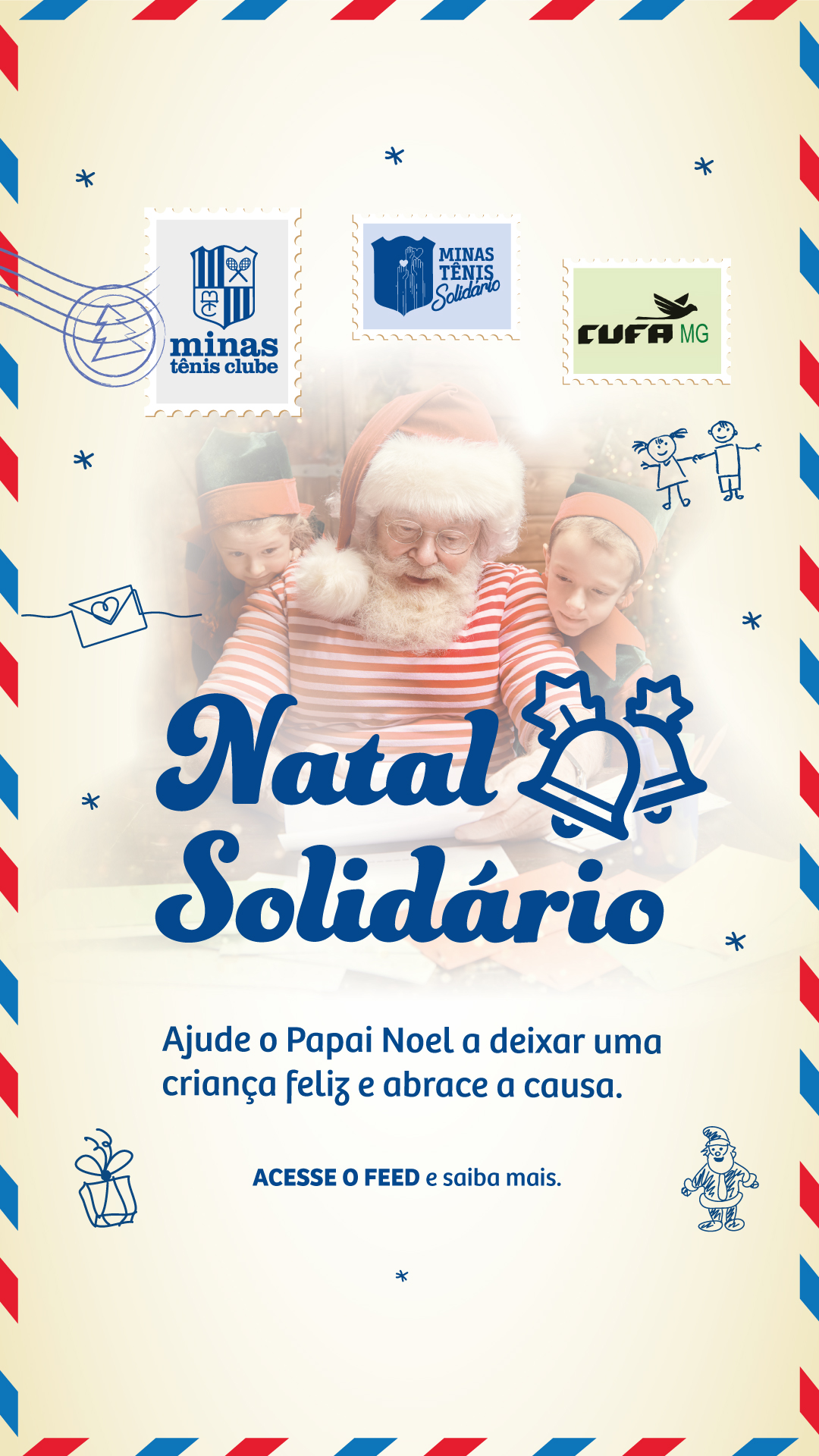 O Programa Minas Tênis Solidário (PMTS) realizará, a partir do dia 1/12, a campanha em parceria com a Central Única das Favelas (CUFA), que vai disponibilizar para associados e funcionários 306 cartinhas das crianças moradoras do bairro Taquaril para o Papai Noel. As cartas estarão na Central de Atendimento, Minas 1, 2 e Náutico onde os interessados em ser papai e mamãe Noel poderão escolher a cartinha que vão apadrinhar.